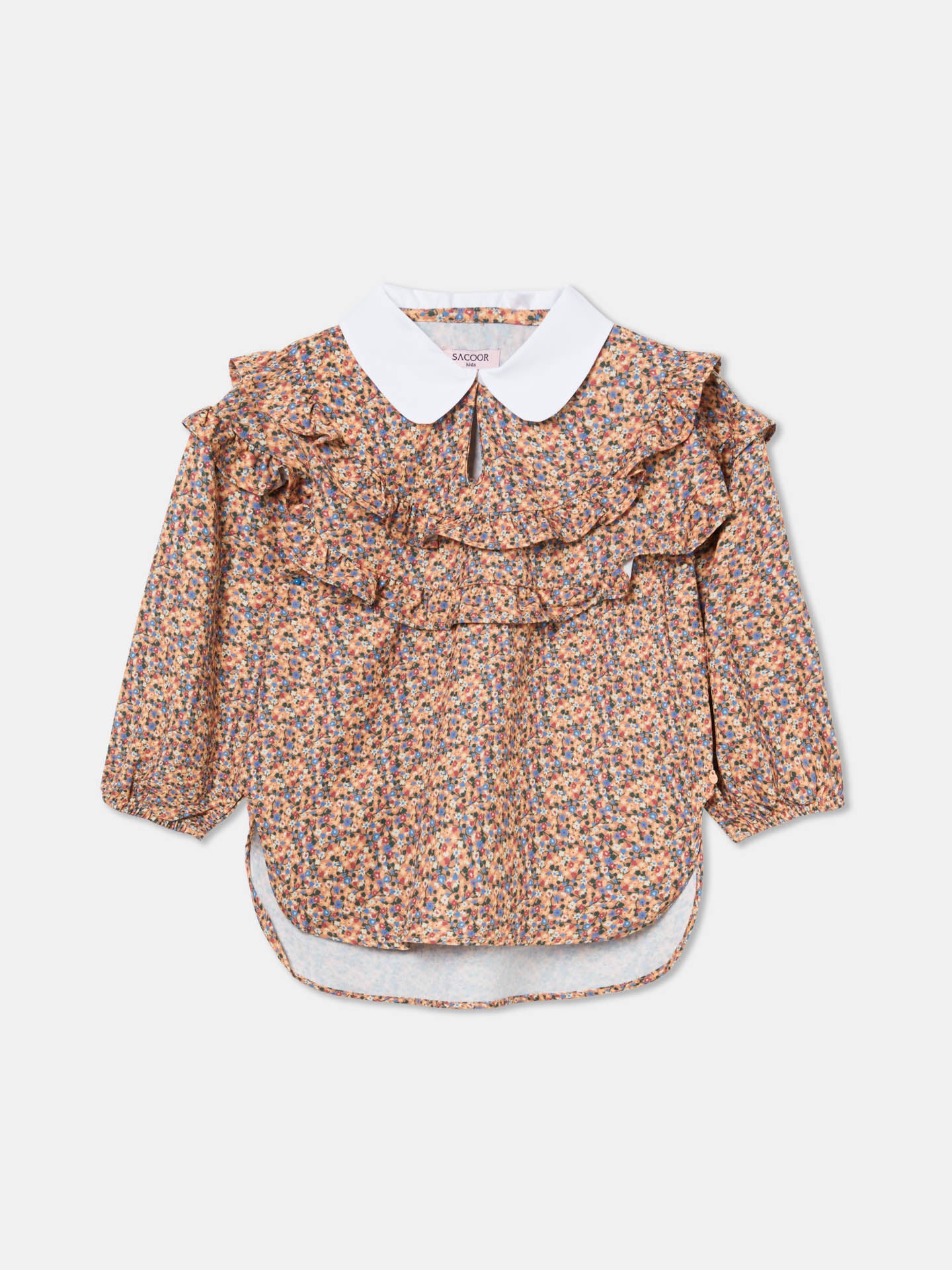 Printed regular fit blouse made of light weight soft textured fabric for maximum comfort and easy care, with Sacoor Original Wildflowers pattern. Featuring 3/4 gathered sleeves with elasticated cuffs, peter pan poplin collar in contrast colour and opening with mother of pearl button and bottom curved cut. Rich details such as self fabric frills around shoulders and Sacoor personalized rose gold plate.