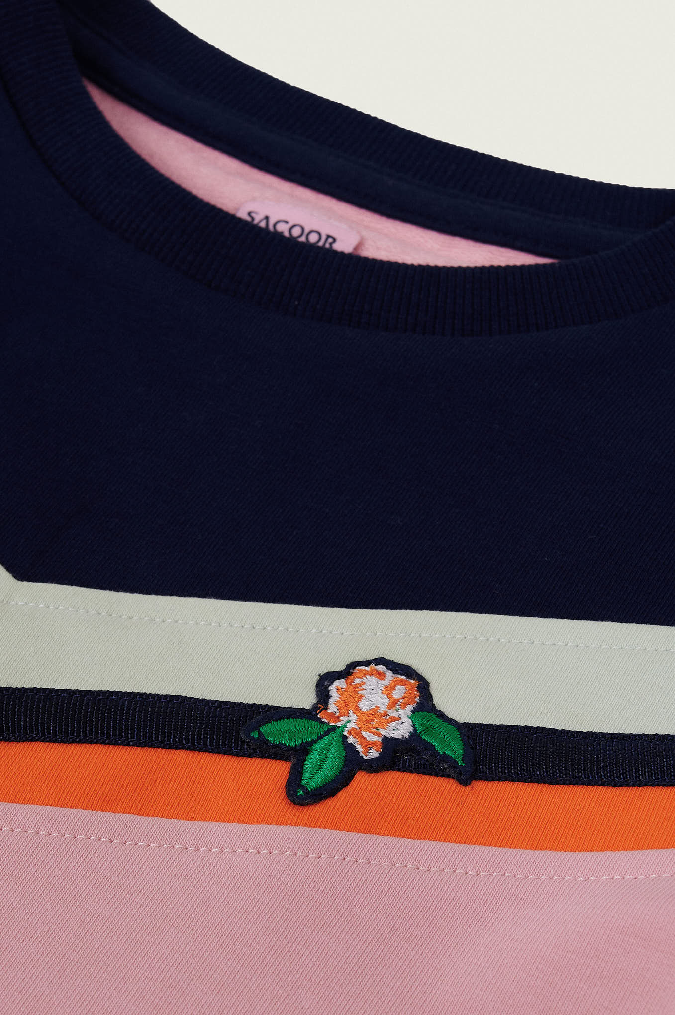 Color block panels sweatshirt with branding tape. Features a knot drapping effect at bottom and a chest badge.