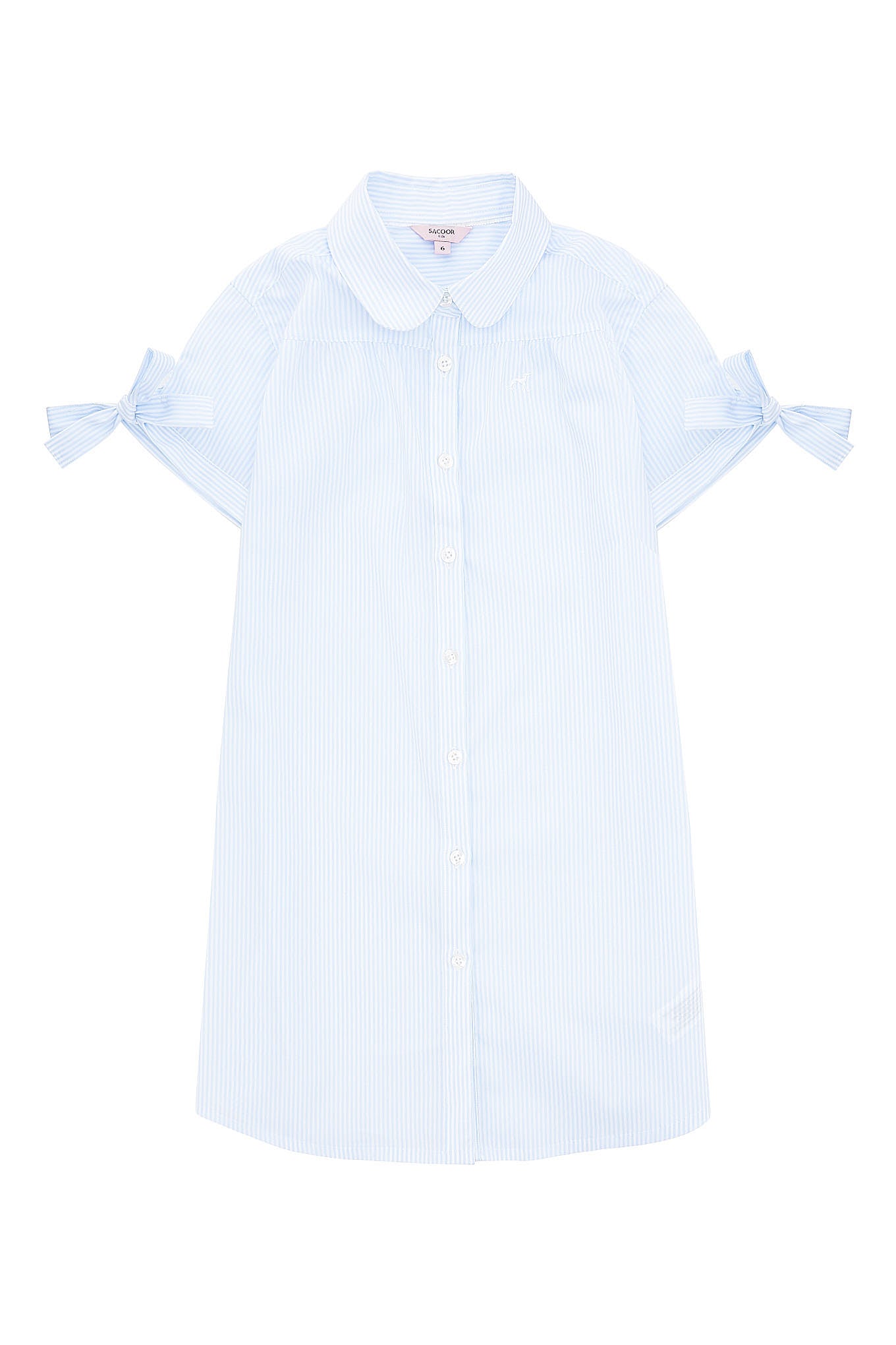 Girl's dress with striped pattern and evasé cut, shirt model. Fastens with buttons to the base. Round collar and embroidered Sacoor logo on chest. Short sleeves with ribbon for tying. Top, front and back pleats give it a very feminine look. Elastane blend gives comfort and greater freedom of movement. For girls who like to run and jump!