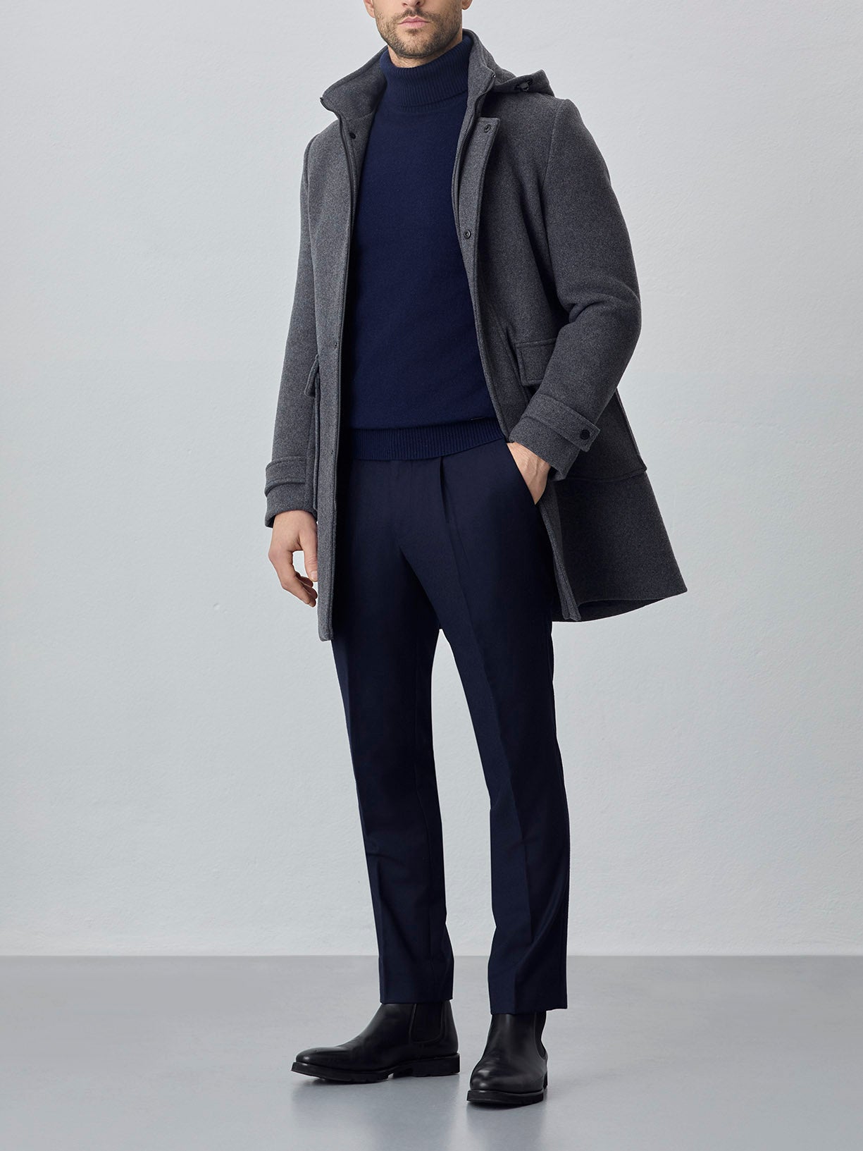 Duffle coat in high quality wool blend. Featuring brand snap buttons on front placket with zipper closure and patch pockets on front. Full personalized lining for total comfort .