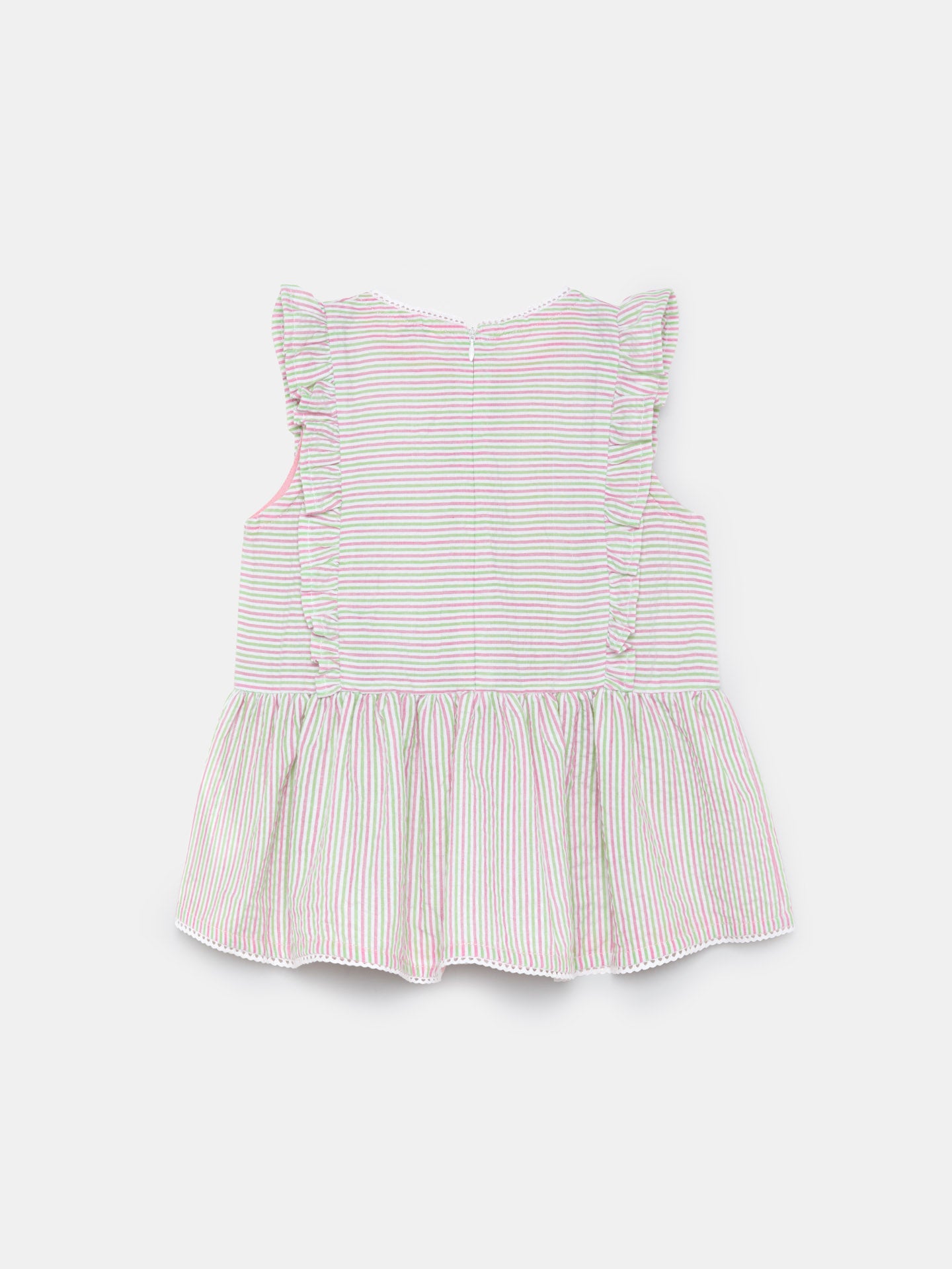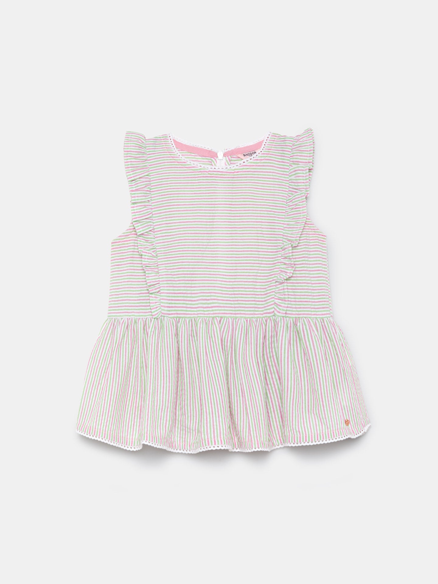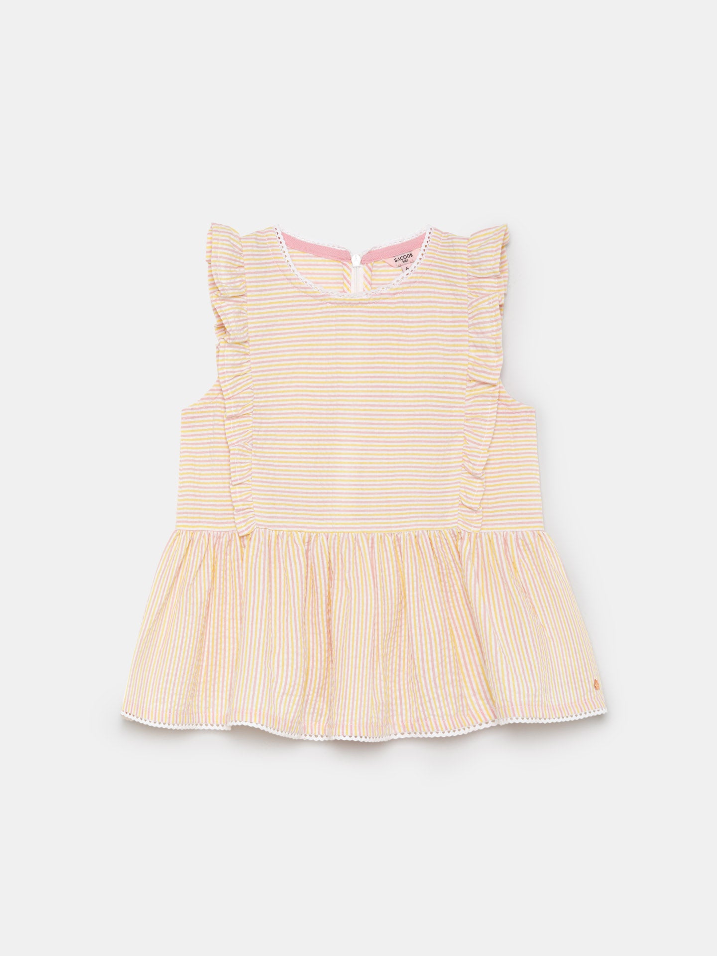 Striped blouse made of light weight cotton mix seersucker fabric for maximum comfort and easy care. Featuring frill on shoulders, peplum at bottom and center back openning with zipper. Rich details such as decorative tape and Sacoor personalized rose gold plate.