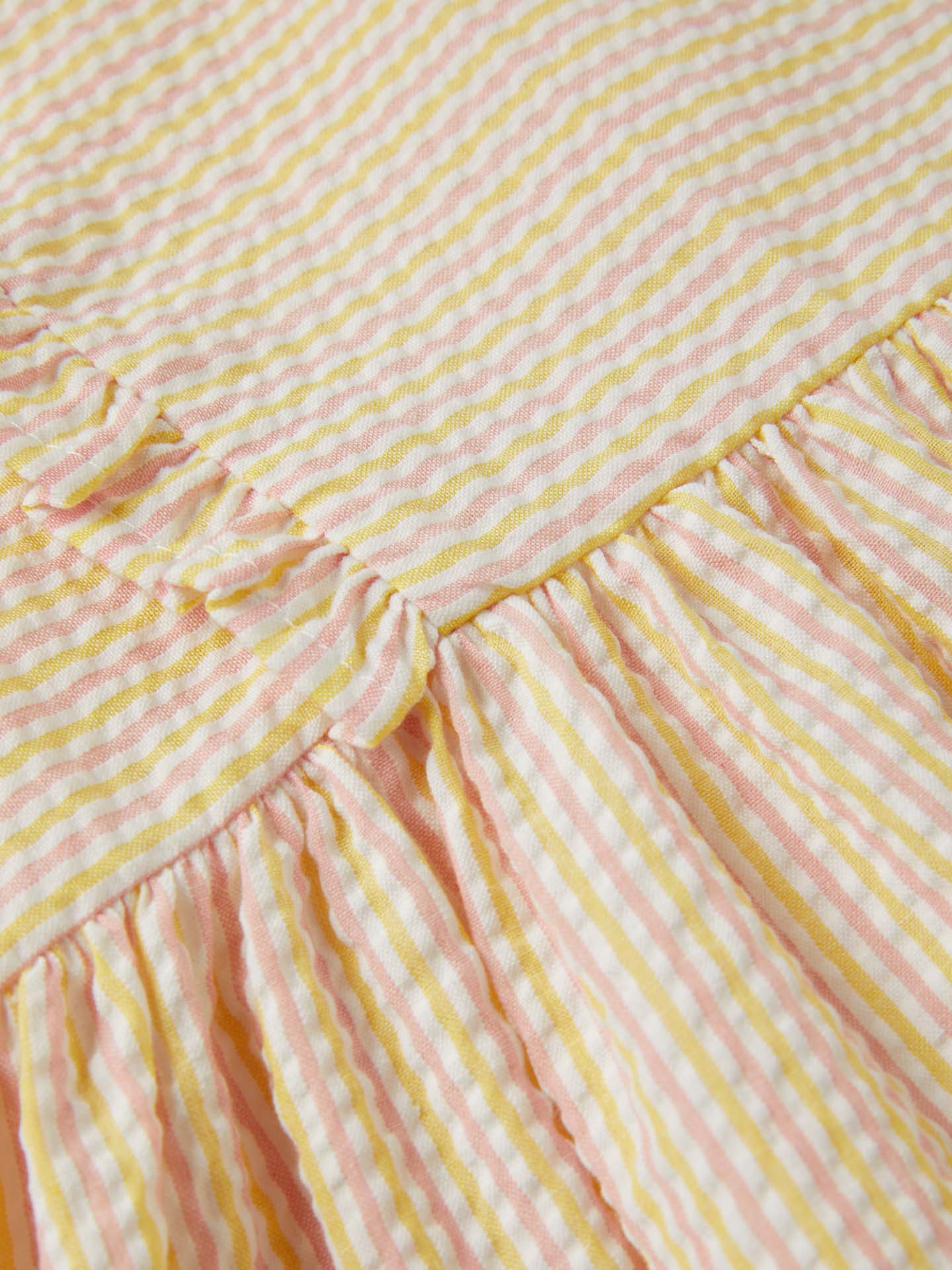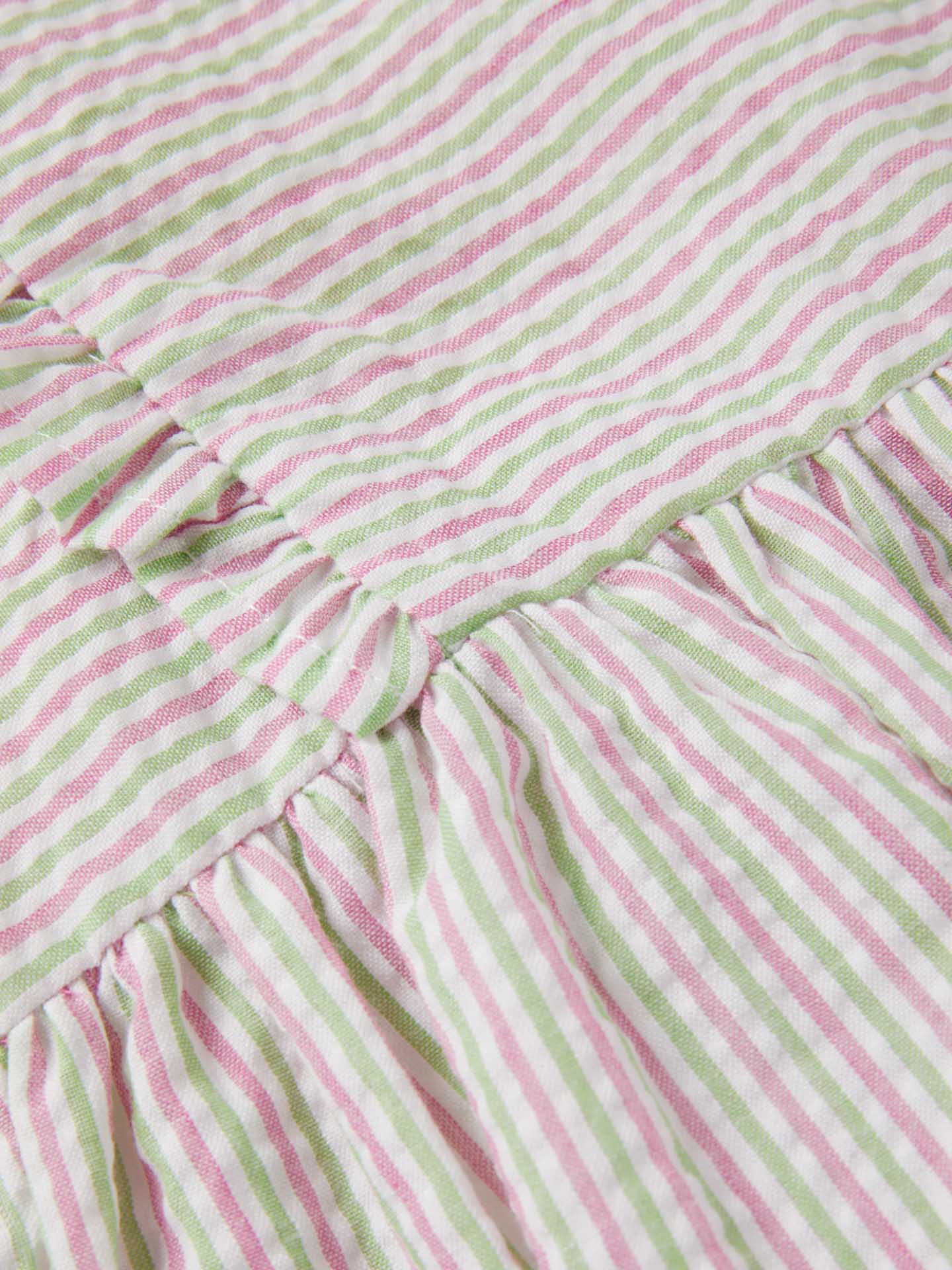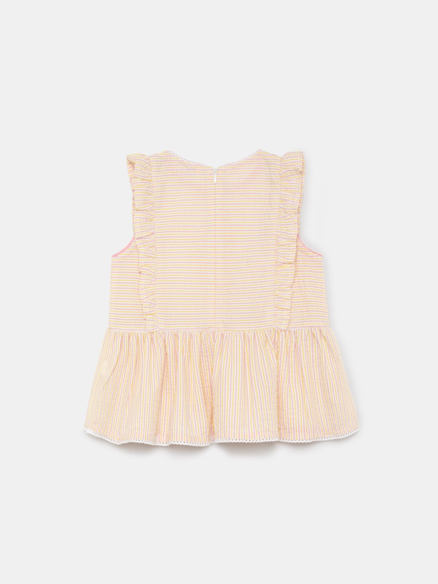 Striped blouse made of light weight cotton mix seersucker fabric for maximum comfort and easy care. Featuring frill on shoulders, peplum at bottom and center back openning with zipper. Rich details such as decorative tape and Sacoor personalized rose gold plate.