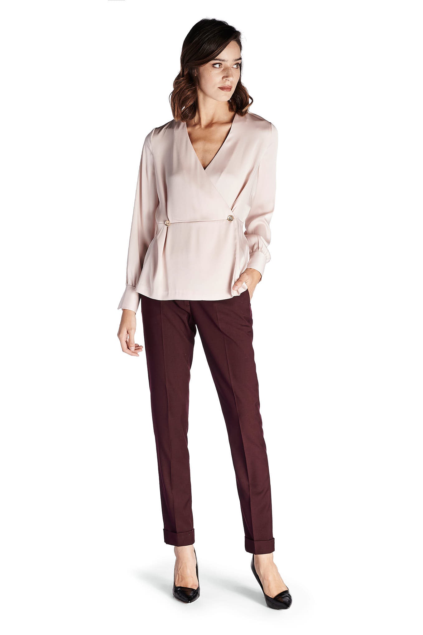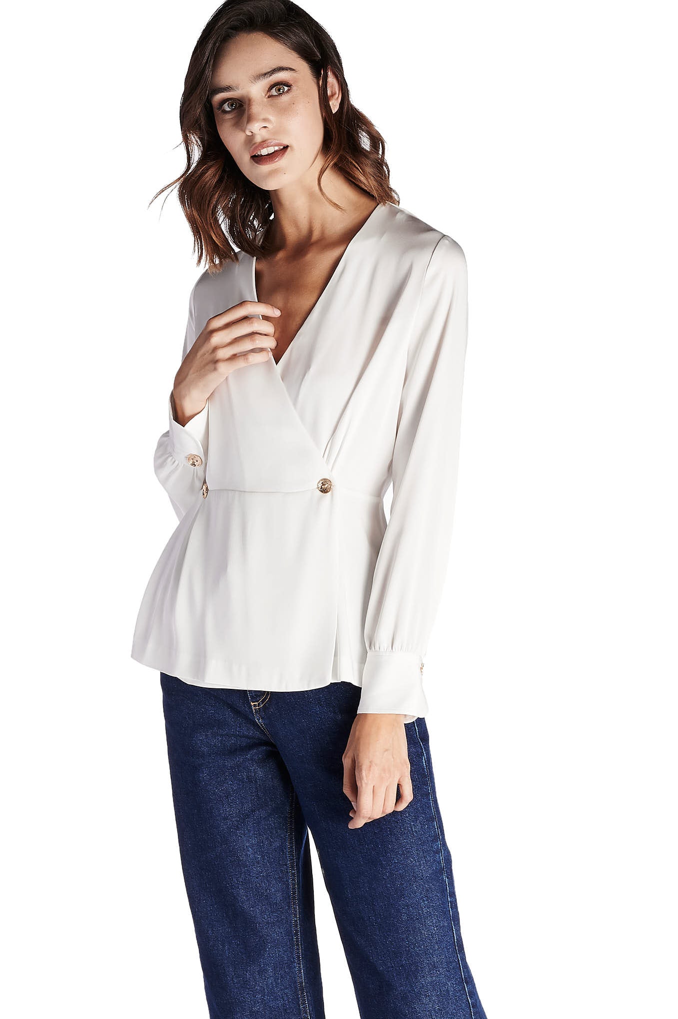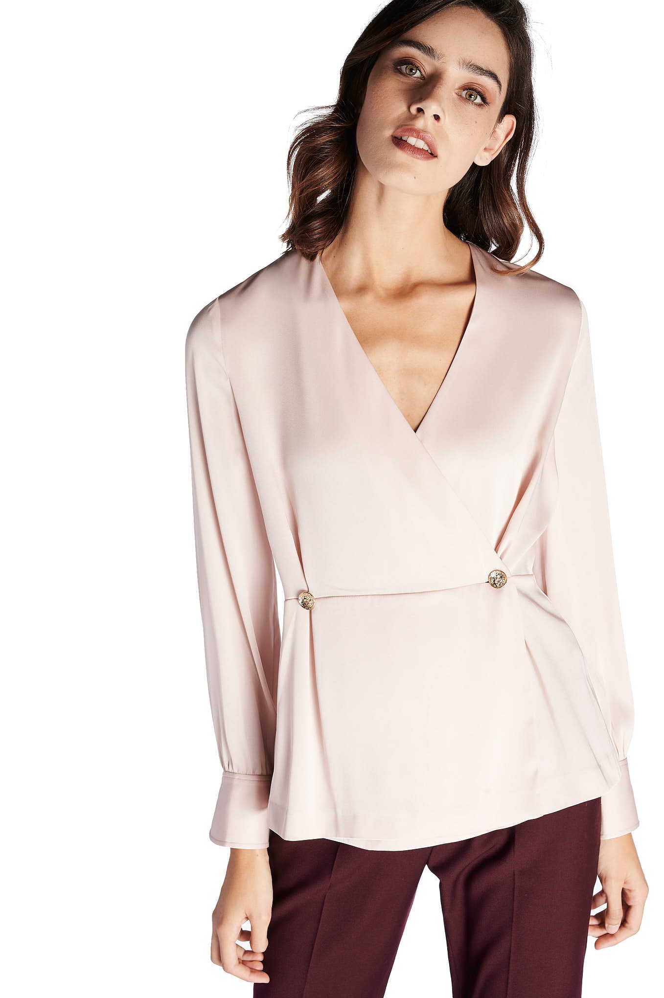 A feminine blouse, in a delicate and fluid fabric. Assorted cut, with highlight of the stylized buttons in gold metal. Large V-neckline. Loose long sleeve, wrinkled at the cuff. A blouse to match with the skirts, chino trousers and other proposals Sacoor.