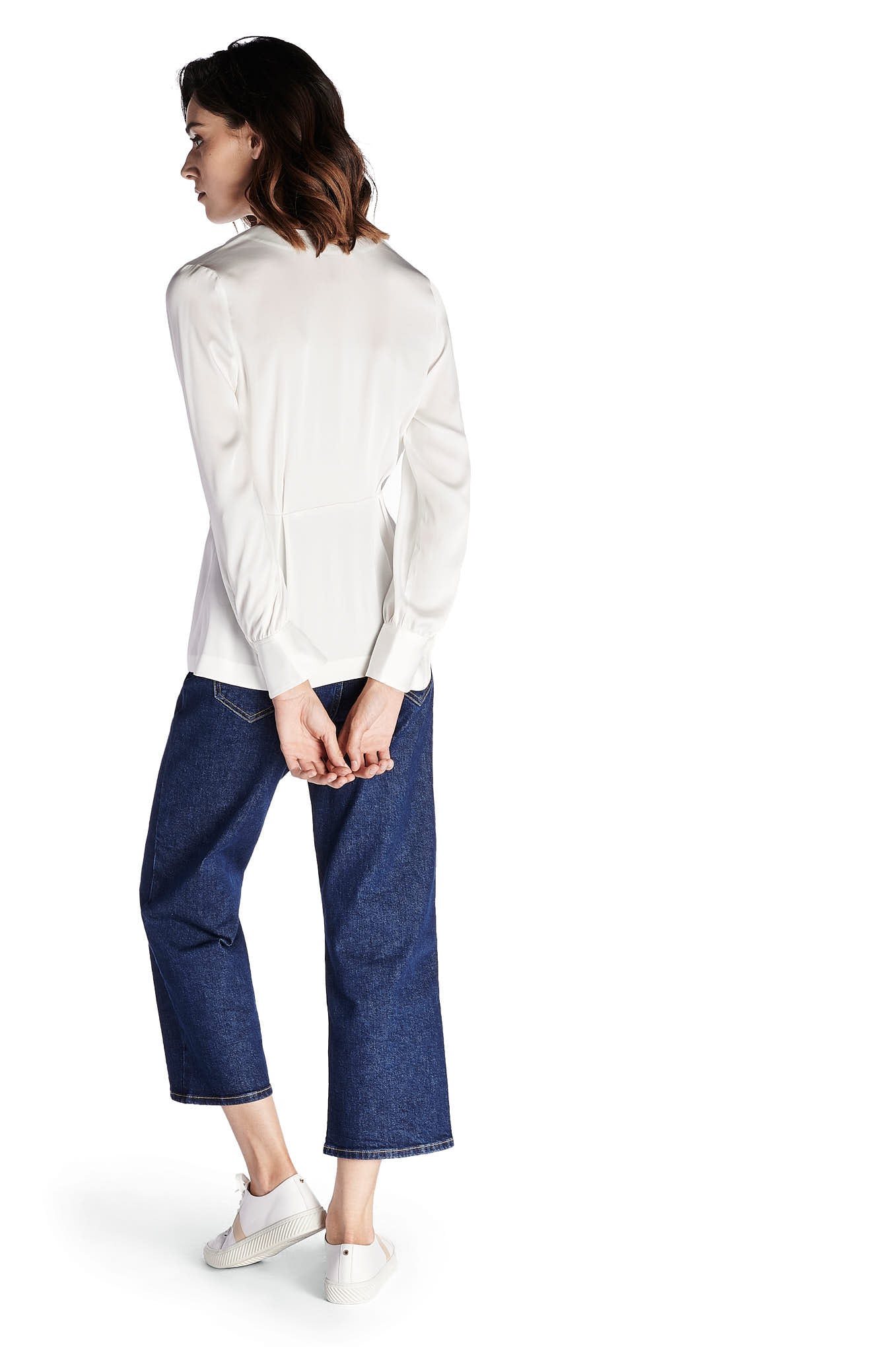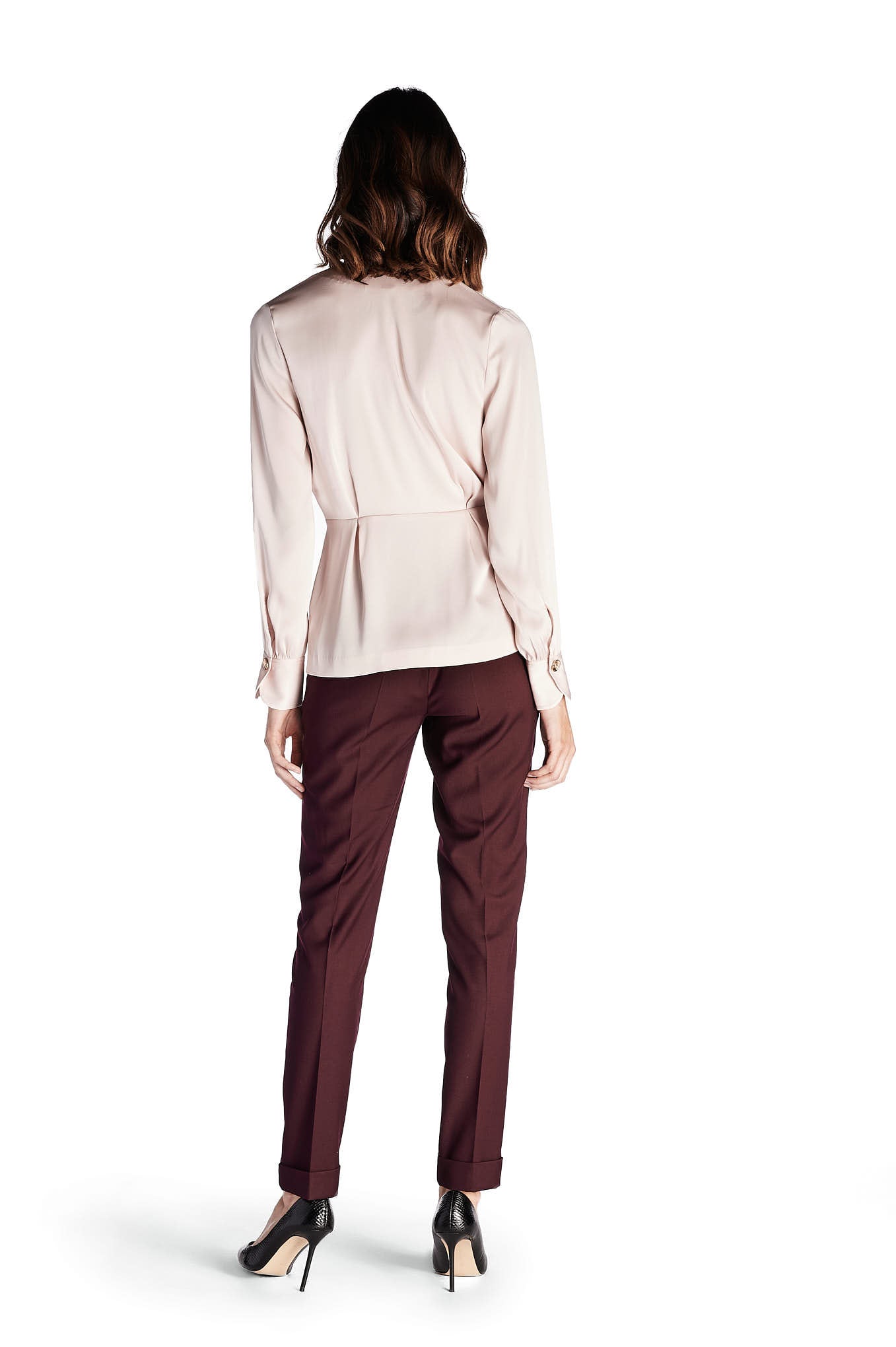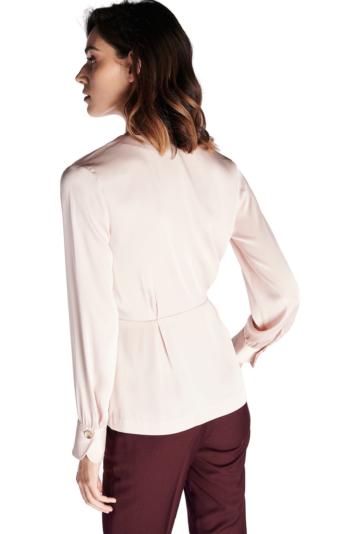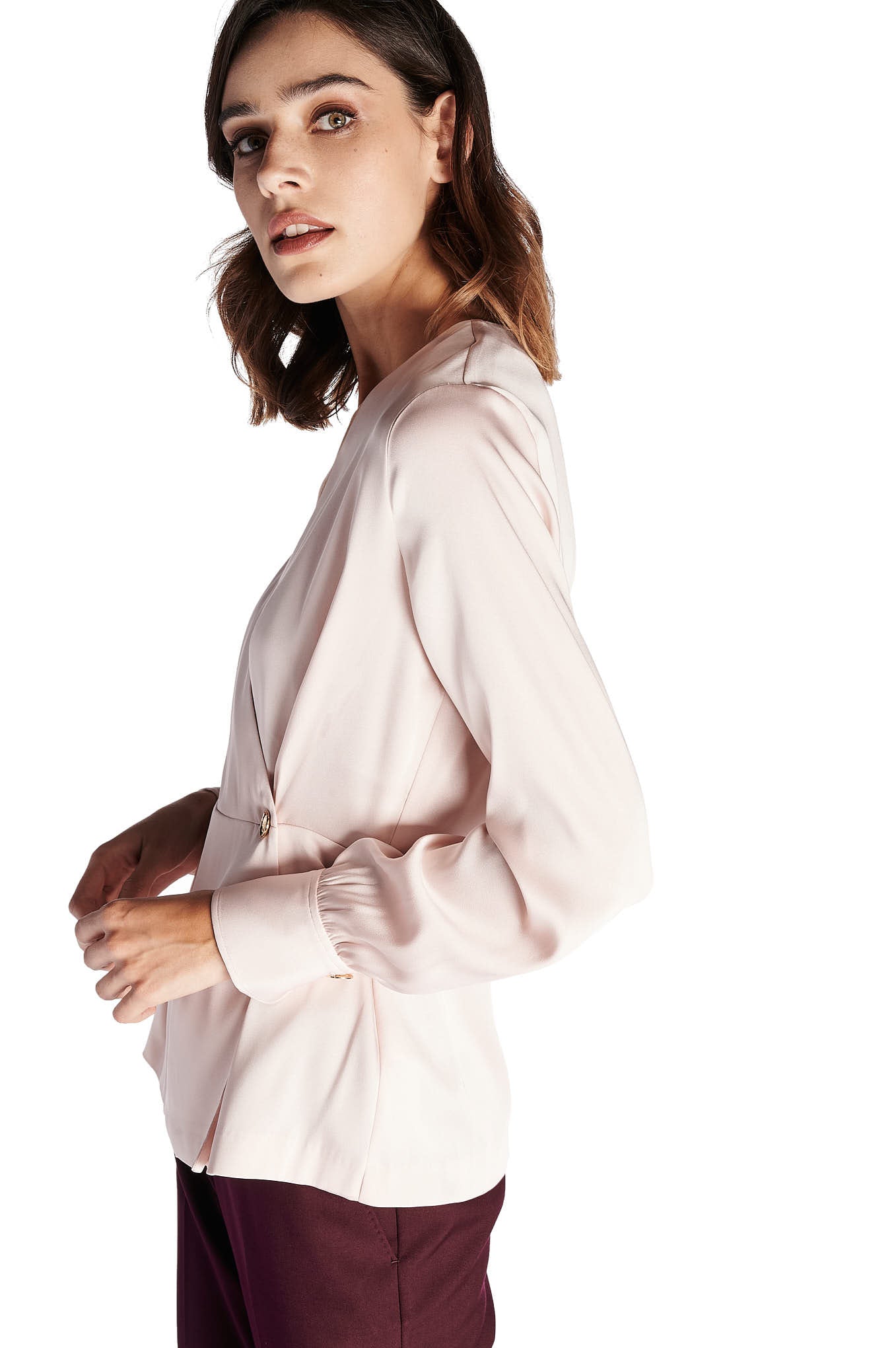 A feminine blouse, in a delicate and fluid fabric. Assorted cut, with highlight of the stylized buttons in gold metal. Large V-neckline. Loose long sleeve, wrinkled at the cuff. A blouse to match with the skirts, chino trousers and other proposals Sacoor.