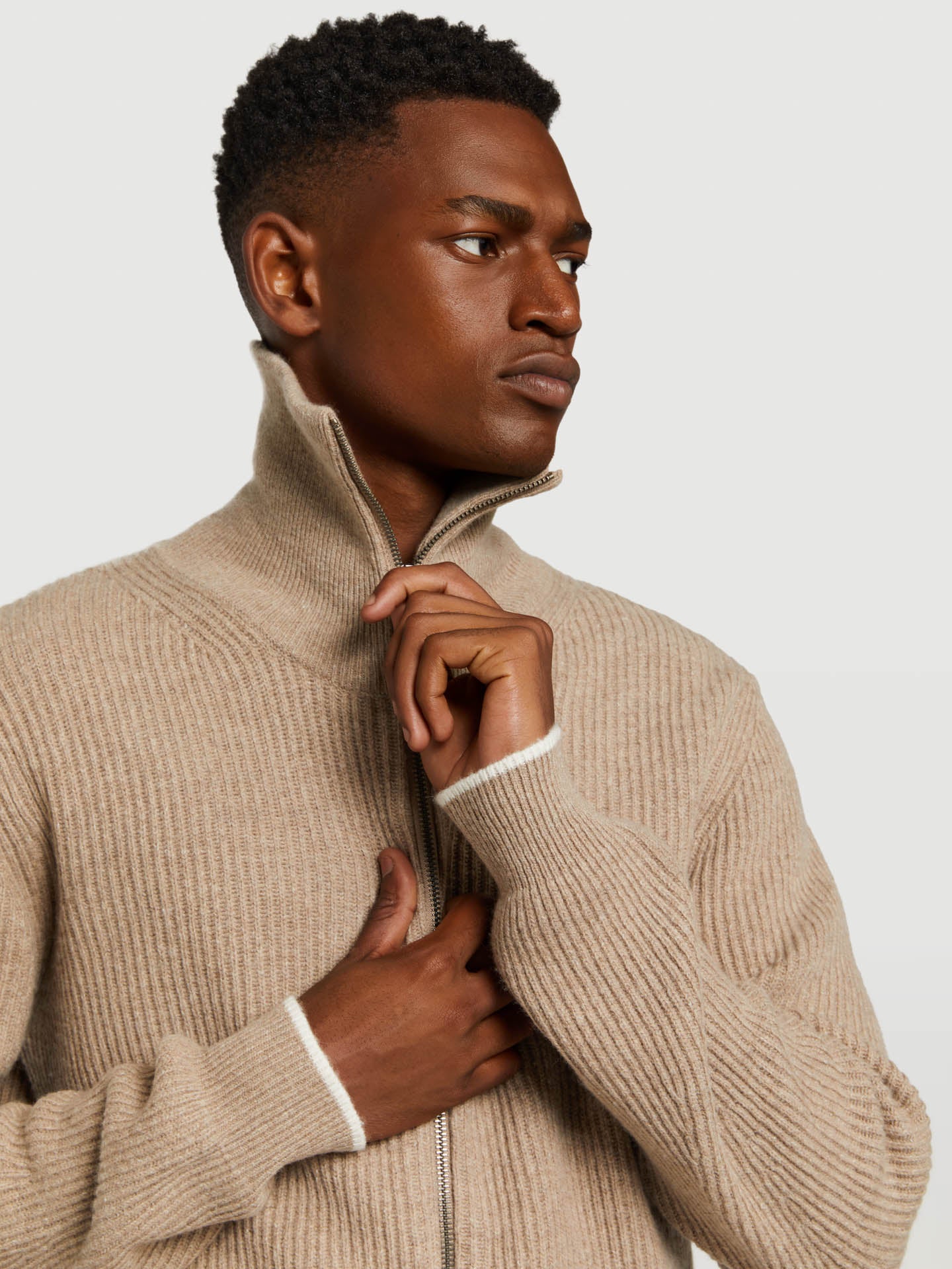 High collar zipped cardigan with fancy rib knitting